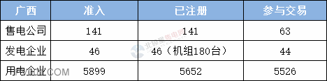 根据广西电力交易中心数据显示,截止2020年2月底,广西电力交易中心共准入141家售电公司、46家发电企业和5899家用电企业。在准入的141家售电公司中,参与交易的有63家,占比45%。一半多的售电公司并未参与到正式交易中,可见大多数售电公司还在观望、摸索期,对正式参与交易还没有完全准备好。