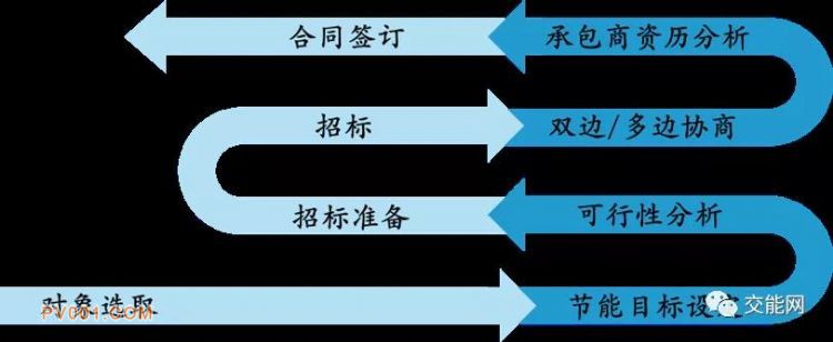 节能对象确定(即选取需要节能的建筑)、2.节能目标设定,3.可行性分析,4.招标准备,5.招标,6.协商,7.承包商资历分析,8.合同签订。