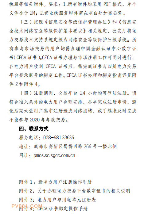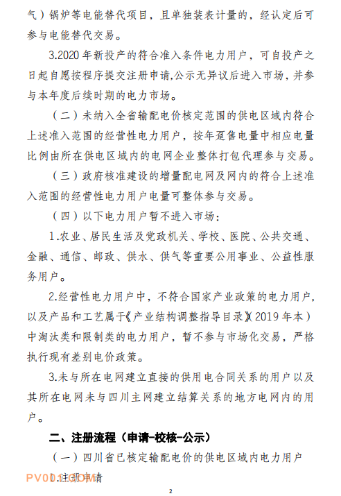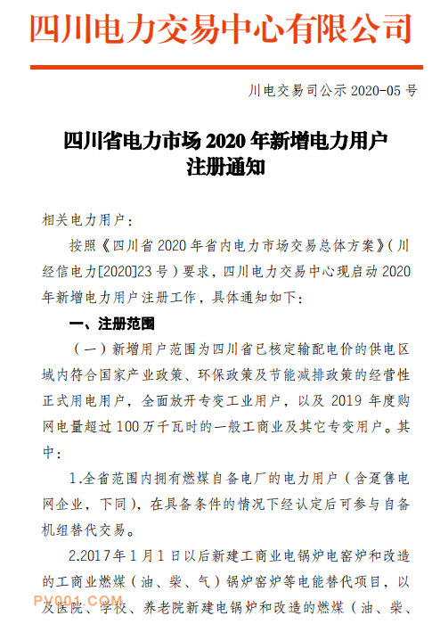 近日获悉,按照《四川省2020年省内电力市场交易总体方案》(川经信电力[2020]23号)要求,四川电力交易中心启动2020年新增电力用户注册工作,注册范围为: