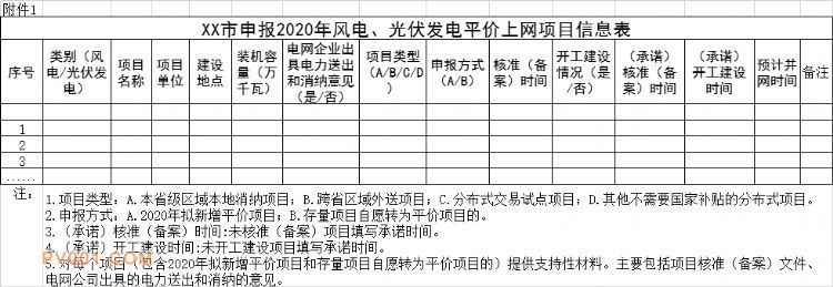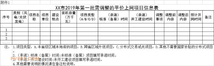 (二)请各地将组织企业申报情况、拟申报平价上网项目信息表(见附件1)、电网接入和消纳支持性意见报我局,已核准(备案)项目需同时提交核准(备案)文件。对2019年国家公布的我省第一批风电、光伏发电平价上网项目,如需调整的,请将项目信息(见附件2)一并报我局。