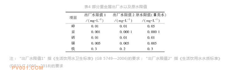 根据《生活饮用水卫生标准》(GB 5749—2006)、《生活饮用水水质标准》(DB31/T 1091—2018),以及《地表水环境质量标准》(GB 3838—2002)的要求,出厂水以及原水中的砷、汞、硒、铁、锑限值如表4所示。