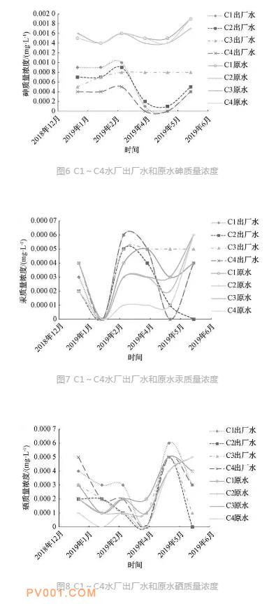 由图6~图10可知:以C水库为水源的各水厂砷、铁出厂水质量浓度始终显著低于原水;锑出厂水质量浓度在4月之后低于原水;汞、硒出厂水质量浓度高于原水的情况比较普遍。