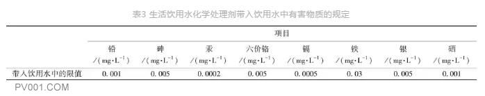 此外,我国卫生部2001年9月发布了《生活饮用水化学处理剂卫生安全评价规范》,也对水处理剂带入到饮用水中的重金属容许限值做了要求,如表3所示。