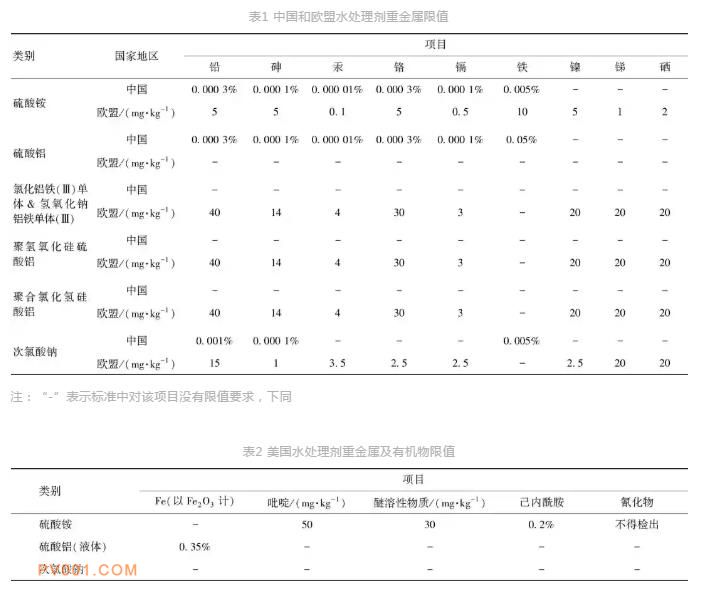通过与欧盟和美国的水处理剂标准比较,结合我国《生活饮用水化学处理剂卫生安全评价规范》,对我国现有水处理剂有害杂质指标汇总如下。