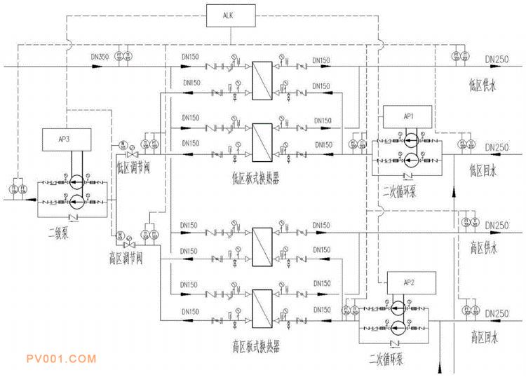调节阀、低区板式换热器、高区板式换热器、低区二次循环泵、高区二次循环泵和中央控制器ALK,所述二测泵的一端分别连接高区调节阀和低区调节阀,高区调节阀还连接低区板式换热器,高区调节阀还连接高区板式换热器,低区板式换热器还通过低区二次循环泵连输出低区供水。本发明可实现换热站只使用一个二级泵达到各个区域平衡供温,实现了泵前加入阀的控制方式,并可各自设置目标温度,使得