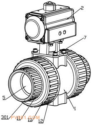 阀门技术领域,包括阀体、旋转气缸、旋转机构以及密封件,所述阀体上于水平方向开设有水平通孔一,于竖直方向开设有自上端延伸至水平通孔一的竖直通孔,阀体的上端可拆卸连接有支撑架,所述旋转气缸安装于支撑架的上端,所述旋转机构安装于旋转气缸的输出端上,并用于控制流通介质在阀内的启闭及流速,所述密封件设置于阀体内部,并同于配合旋转机构来对阀内的流通介质进行密封。本发明有效的增强了阀体的阻流效果;能够实现本阀适配于不同口径的连通管道,阀芯与密封件二者分离的结构,便于拆卸且具备通用性的同时更加节约了维护成本。