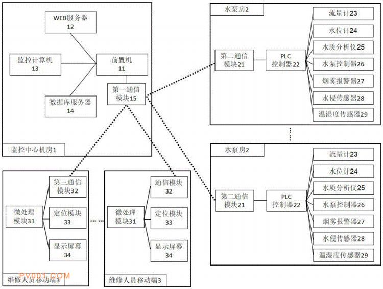 水泵房维修派单系统,包括:监控中心机房、至少一个