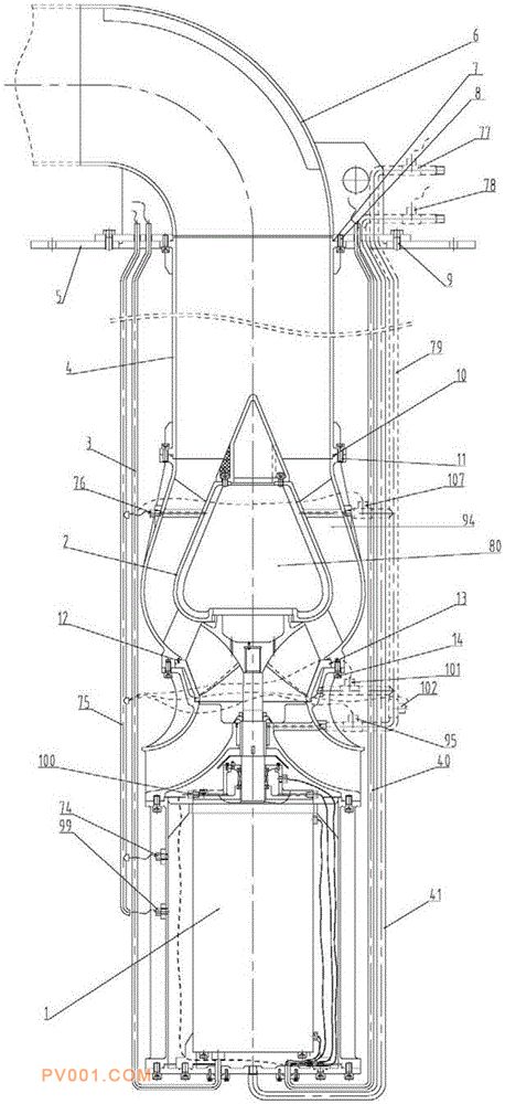 潜水泵,由上至下依次连接的出水段、扬水管、导流体和转子部件,转子部件包括进水段、叶轮、叶轮室、电机加长轴、电机、筒体和端盖,进水段、筒体、端盖之间形成冷却润滑腔,导流体与叶轮之间形成平衡腔,叶轮室与进水段之间调压腔,并设有分别与冷却润滑腔、平衡腔、调压腔、轴承连通的冷却孔、缓冲孔、调压孔和冲洗孔,并在轴套的两侧分别设有压紧的一级抛沙盖和二级抛沙盖,使本实用新型的泵实现冲洗、冷却润滑、残余轴向力平衡、叶轮间隙调整和启动缓冲功能,并设温度检测探头、压力检测探头和漏水检测探头进行监测和实现自动化,降低泵的运行振动、噪声,提高轴承和转子部件的使用寿命,加强泵的运行安全可靠性。