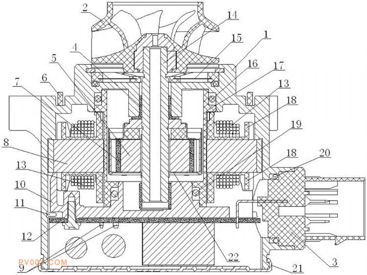 水泵无需蜗壳,以便将蜗壳集成到发动机缸盖上,减小了电子水泵的体积,降低了泵体安装支架的载荷以及自身振动,有利于延长电子水泵的使用寿命,并且提高其工作效率,降低电子水泵的制造成本。