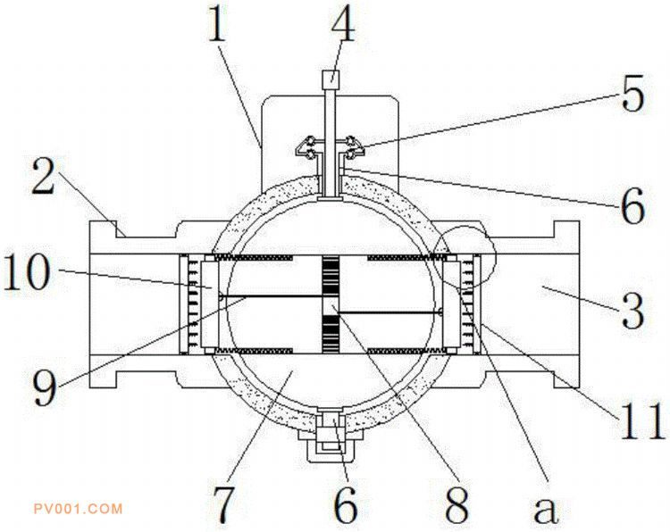 球阀,过滤网在球体的内部可以很好的进行移动工作,在过滤网移动到顶端位置的时候,会与安装板上的连接杆进行接触,在连接杆上旋转杆和固定杆与过滤网上网孔的卡合,可以很好的达到清堵工作。