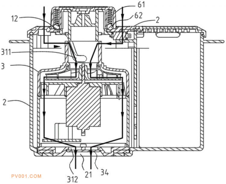 专利摘要:公开(公告)日:2020-06-19摘要:本实用新型公开了一种可充排气两用的内置式电动气泵,包括连接座、外壳、泵主体和驱动组件,连接座具有第一气口;外壳具有第二气口,通过驱动驱动组件带泵主体上下移动能够实现第二气口的开合;泵主体包括壳体、叶轮结构和电机,壳体设有进风口和出风口,电机的电路板设有电源控制电路,交直流转换电路、DC?DC转换电路、整流滤波输出电路、电压反馈电路、尖峰抑制电路和电压输出接口。本实用新型通过对排气结构、叶轮结构和电源控制电路的改进,实现内置式气泵充气和换气状态的便捷转换;以及提高气泵的抽、排气效率,降低噪音。