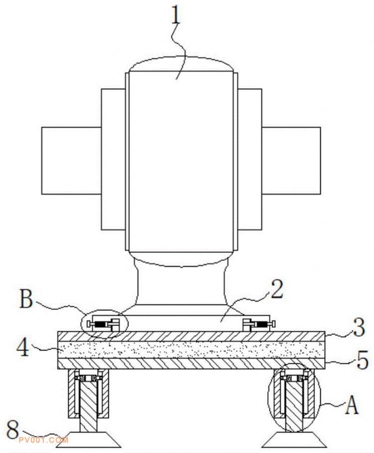 专利摘要:公开(公告)日:2020-06-16摘要:本发明涉及机械设备技术领域,且公开了一种吸沙泵用水平调节装置,包括吸沙泵、底座、上支撑板、橡胶缓冲层和下支撑板,吸沙泵固定安装在底座的上表面,底座的下表面对称开设有条形槽,上支撑板的上表面对称固定连接有与条形槽卡合设置的条形板,且条形板与条形槽之间安装有拆装机构,橡胶缓冲层固定连接在上支撑板和下支撑板之间,且下支撑板底部的四角处均通过调节机构连接有支撑脚;调节机构包括固定连接在支撑脚上表面的螺杆,下支撑板的底部固定连接有与螺杆相对应的螺纹筒,且螺纹筒为底端开口的中空机构。本发明不仅有效保证吸沙泵水平调节的稳定性,而且提高了吸沙泵的拆装效率。