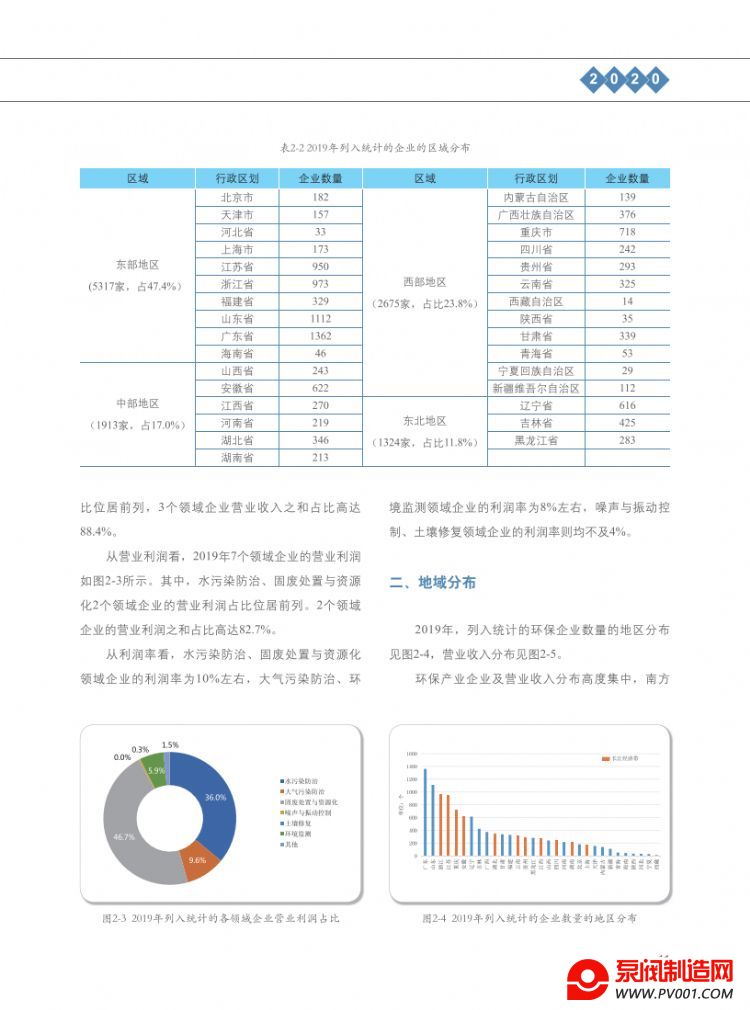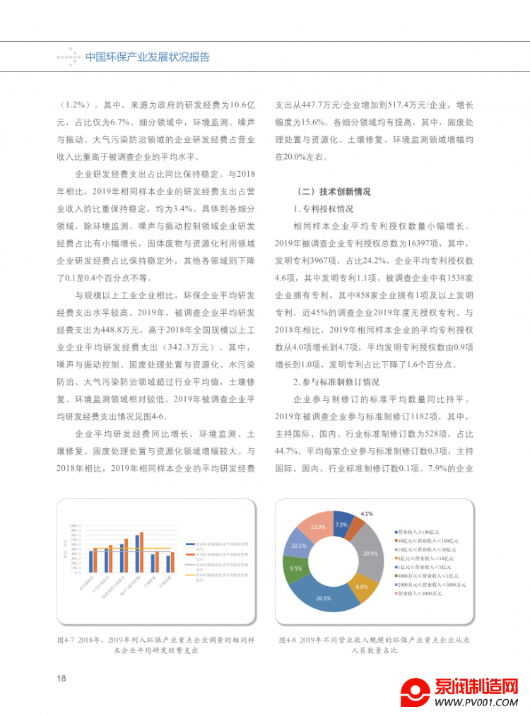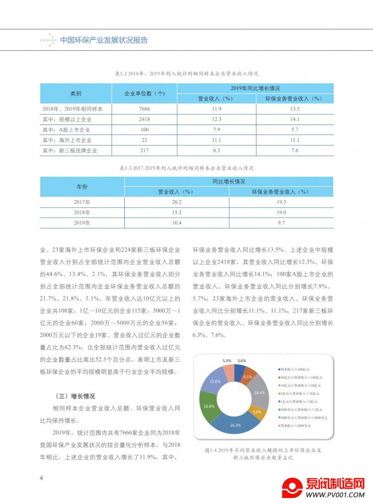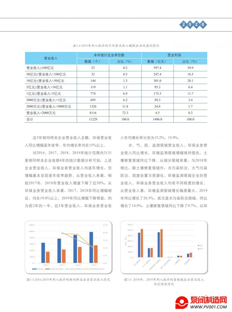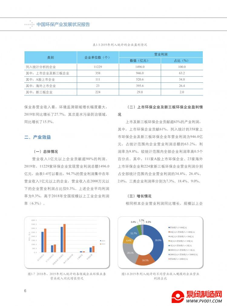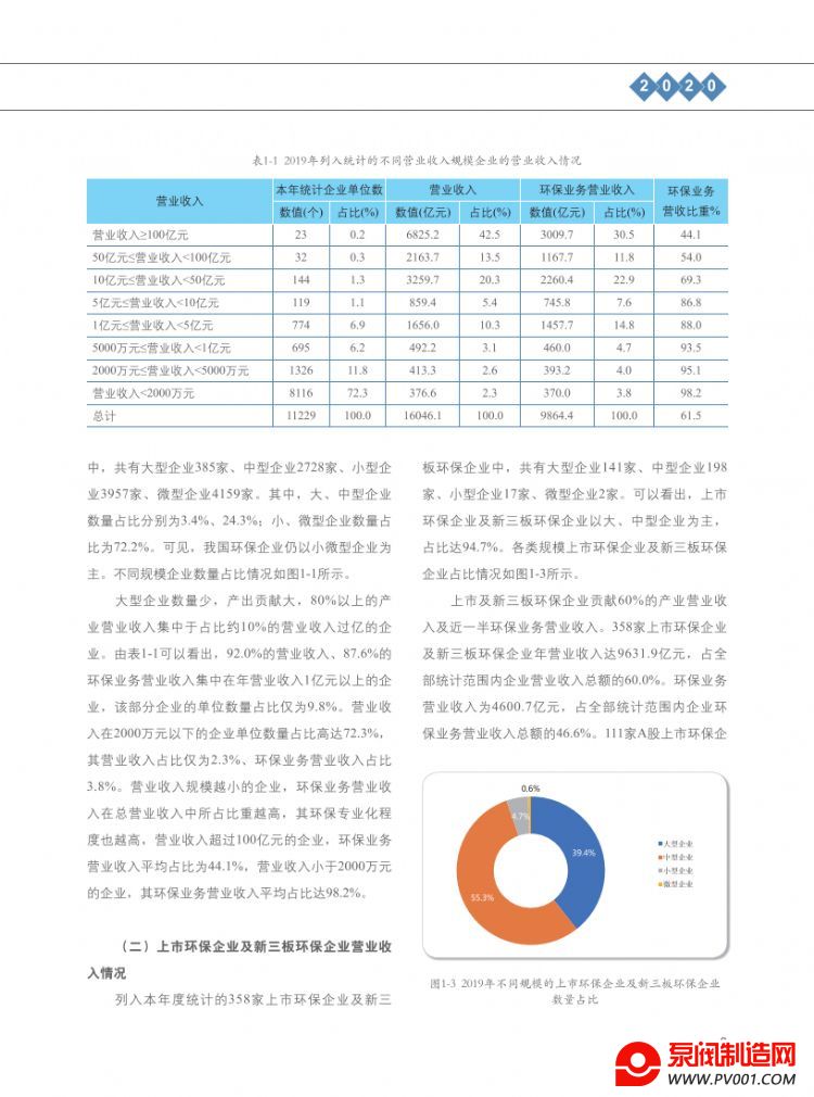 从企业规模看,列入统计范围的环保企业,大、中型企业数量占比分别为3.4%、24.3%;小、微型企业数量占比为72.2%。其中,营业收入在1亿元以上的企业,以9.8%的企业数量占比(较上年降低了0.6个百分点),贡献了超过92%的营业收入和利润。