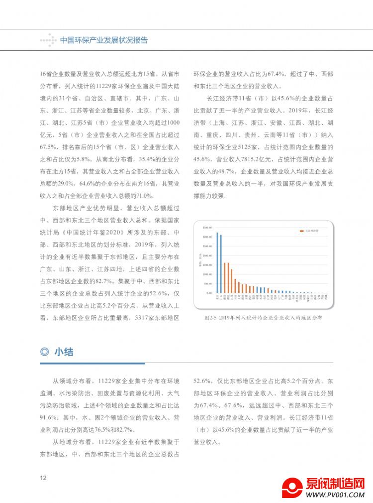从地域分布看,统计范围内企业有近半数集聚于东部地区,东部地区环保企业的营业收入、营业利润占比分别为67.4%、67.6%,远远超过中、西部和东北三个地区企业的营业收入、营业利润。长江经济带11省(市)以45.6%的企业数量占比贡献了近一半的产业营业收入,对我国环保产业发展支撑能力较强。