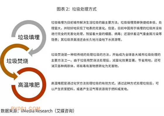 终端处理阶段,主要有垃圾填埋、垃圾焚烧及高温堆肥三种方式。目前,垃圾填埋是垃圾处理的主要方式,但这种方式容易污染地下水资源,潜伏着空气、重金属污染等隐患,目前主要国家都在从垃圾填埋像垃圾焚烧的方式转变。高温堆肥是通过化学方法处理垃圾的有效方式,这种方式可以产生农家肥料或者产生沼气用于发电,但是目前高温堆肥的成本较高,技术还未能投入市场化应用阶段,是未来垃圾分类处理的发展趋势。
