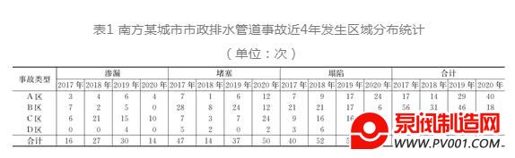 本文主要采用现场调查、资料收集和数理统计的方法开展对南方某城市A区、B区、C区和D区四区(以下简称“调查区”)2017年、2018年、2019年和2020年排水管道运行情况的研究。