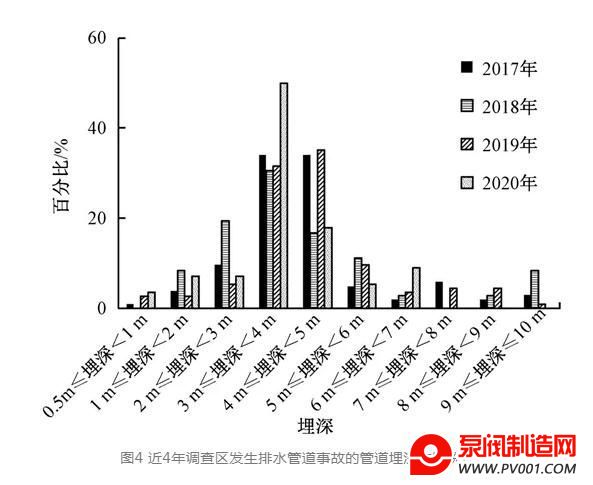 不同埋深市政排水管道事故(指渗漏、堵塞和塌陷三类事故)发生情况如图4所示,从图4中可以看出,市政排水管道事故发生率与埋深有一定关系,在管道埋深大于2 m以上时,管道出现的事故率随埋深而逐步增大,而埋深超过5 m之后事故率有下降趋势,事故发生率较高的埋深在2~5 m,最高事故发生率在3~5 m,最高事故率发生在2020年,约50%左右,其他3年也高达30%左右。分析原因主要是管道埋深增加之后,管道承受的土压负荷会有所增加。此外,南方某城市为滨海城市,城市地下水位较高,管道埋深大于3 m后,管道基本上都处于地下水包围之中,并且可能有海水的长期侵蚀,容易加快管道腐蚀或性能产生变化而产生事故。