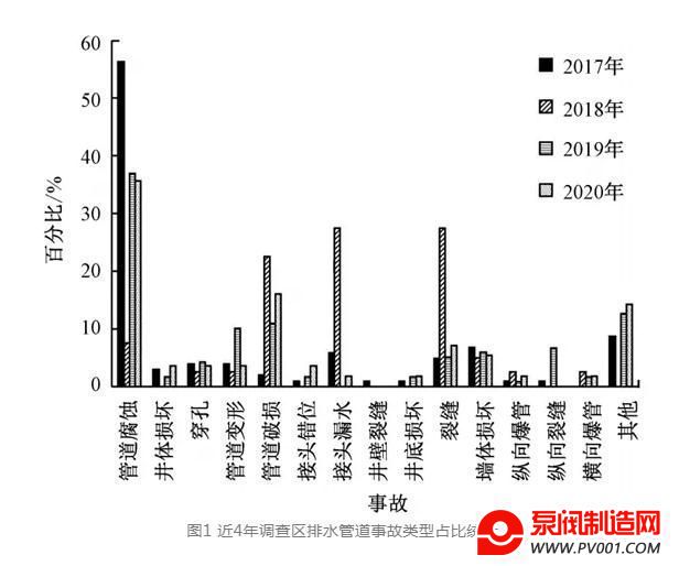 将排水管道事故类别细分为15项,分别为管道腐蚀、井体损坏、穿孔、管道变形、管道破损、接头错位、接头漏水、井壁裂缝、井底损坏、裂缝、墙体损坏、管道纵向爆裂(简称纵向爆管)、纵向裂缝、管道横向爆裂(简称横向爆管)以及其他,统计近4年调查区排水管道事故类型占比情况见图1。从图1中可以看出,事故类别占比最高的事故类别有管道腐蚀、接口漏水、裂缝和管道破坏等。2017年、2019年和2020年事故率较高的均为管道腐蚀(分别约为56%、37%和36%);2018年事故率较高的为裂缝(约28%)、接口漏水(约28%)和管道破损(约23%)。根据实地调查走访分析事故原因可知,管道腐蚀和裂缝主要原因是排水管道在使用过程中的冲刷和污水腐蚀所致;排水管道一般敷设在道路下面,承受一定的土壤和地面荷载,容易由于荷载不均匀而导致管道产生不均匀受力情况,从而导致管道破裂漏水;管道破坏则主要是在城市建设过程中施工不当而人为引发的。