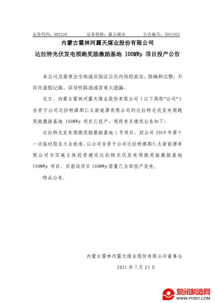 7月24日,露天煤业发布公告称,公司全资子公司达拉特旗那仁太新能源有限公司的达拉特光伏发电领跑奖励激励基地1号项目100MWp项目已投产。