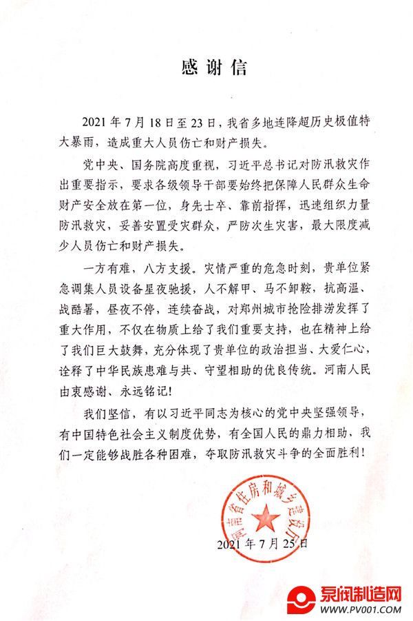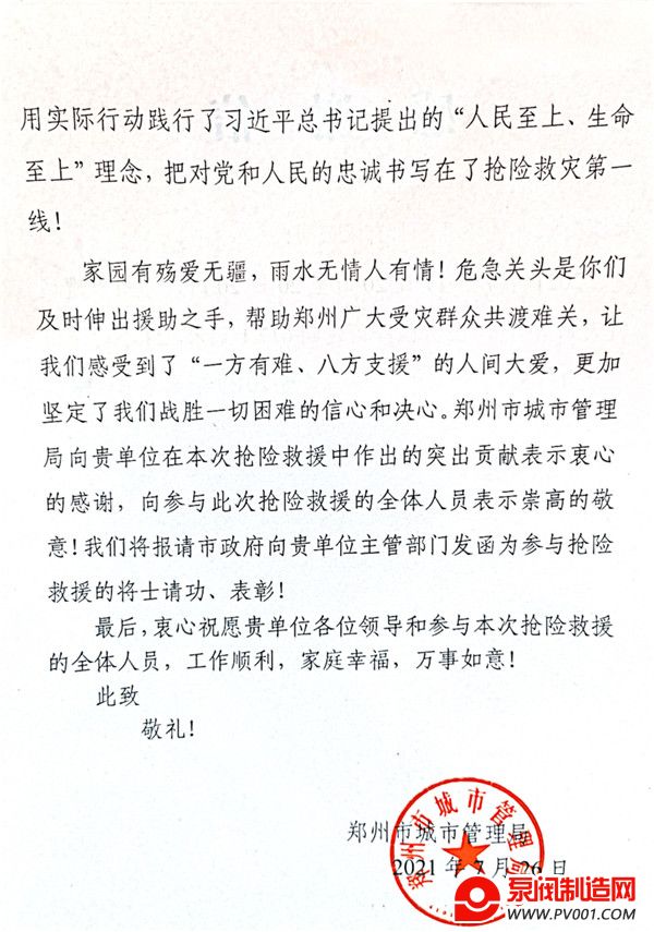 近日,盈峰环境频频收到河南住建厅、郑州市人民政府、郑州市城管局发来的感谢信,对公司近期在河南抗洪排涝、汛后重建工作上作出的贡献给予褒奖及由衷的感谢。