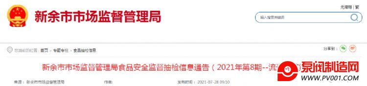 讯 2021年7月28日,江西省新余市市场监督管理局网站发布食品安全监督抽检信息通告(2021年第8期--流通环节第2期)。据通告,新余市市场监督管理局本期公布抽检信息涉及我市流通环节18类食品171批次样品,抽检信息如下: