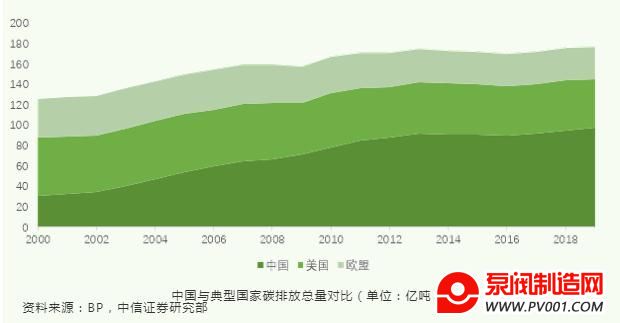 在排放总量方面,目前中国是全球第一大碳排放国,2019年碳排放总量已达到98.9亿吨,占全球比例分别为28.8%,约为美国的2倍、欧盟的3倍;