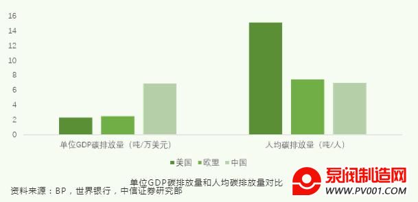 在碳排放强度方面,2019年中国为6.9吨/万美元,中国远高于美国和欧盟的2.3和2.5吨/万美元;