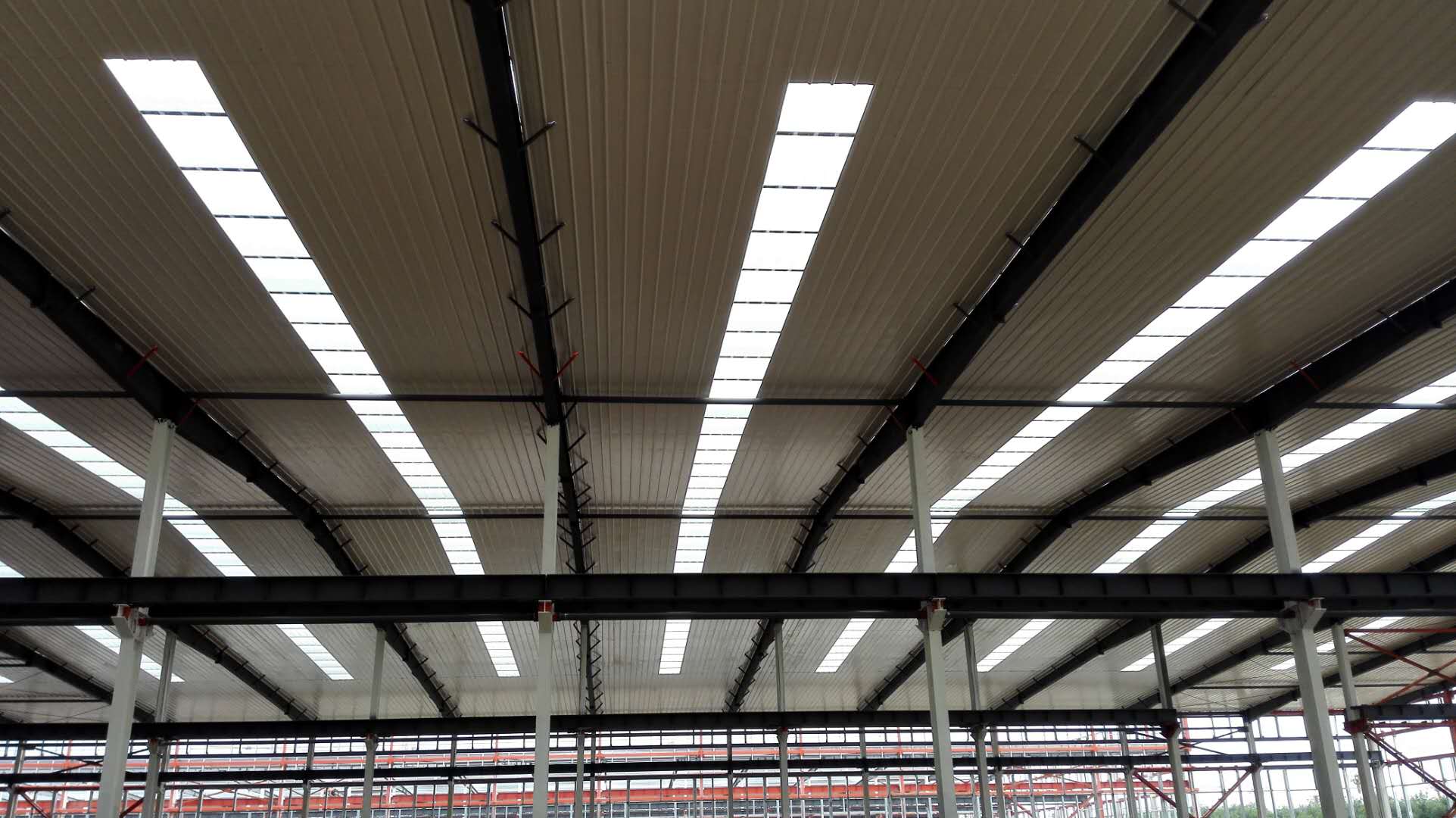 采光板在12m以内无需搭接,超过12m则需要搭接,搭接长度为200-400mm,搭接处施涂二道密封胶,横向搭胶不需收边,纵向彩钢板的搭接需看板型。普通压型钢板,一般不考虚做收边,直接将其与彩板用自攻钉固定,并施涂密封封胶,咬合板则需做收边。采光板纵向长度方向搭接应设置在檀条附近。采光板的常规分类有经济型,耐候型,隔热型,阻燃型,防腐型大类型。采光板常用的规格有750型,840型,820型,980型,950型,900型,475型,760型,以及1m-2m宽平板等100余种板型。