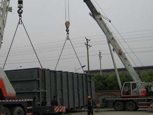 移上移下方法。是在两车之间(如火车及轿车进行靠接,然后使用各种方法,不使货品笔直运动,而靠水平移动从一个车辆上推移到另一车辆上,称移上移下方法。移上移下方法需求使两种车辆水平靠接,因而,对站台或车辆货台需进行改动,并配合移动工具完成这种装卸。散装散卸方法。对散装物进行装卸。一般从装点直到卸点,不再落地,这是集装卸与转移于一体的装卸方法。按被装物的首要运动方式分类。以此可分笔直装卸水平装卸两种方式。按装卸转移目标分类。以此可分红散装货品装卸单件货品装卸集装货品装卸等。按装卸转移的作业特点分类。以此可分红接连装卸与间歇装卸两类一接连装卸首要是同种大批量散装或小件杂货通过接连运送机械,接连不断地进行作业,无中止,货间无间隔。在装卸量较大装卸目标固定货品目标不易构成大包装的情况下适用采纳这一方法。在大型机械设备吊装怎么挑选吊点试吊挑选吊点。通过将起吊物起吊10CM之内,看起吊物歪斜的程度,然后判别,确认适宜的吊点。对称挑选吊点。关于规则的物体,能够依照依照对称的办法进行吊点挑选,需求注意的是两个对称点的间隔不可太远,假如间隔太远,会造成夹角过大,影响到吊装。耳环确认吊点。有的设备装置有耳环,假如耳环是出厂时装置,一般都能够作为吊点;假如耳环是在之前吊装的时候装置,也能够作为吊点。不过需求注意的是,在吊装之前,需求对耳环进行检查,看其是否无缺。捆扎物体的吊点挑选。一般起吊物体的捆扎办法包含平行捆扎笔直斜形绑扎兜挂捆扎等等,关于捆扎的起吊物,吊点与捆扎的部位有关。快捷吊装公司在物体什么部位进行捆扎,关系到吊点是否合理。