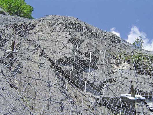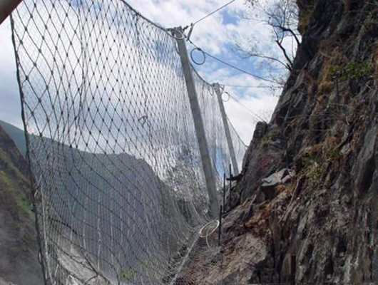由钢丝绳网或环形网(需阻拦小块落石时附加一层铁丝格栅),固定体系(锚杆拦锚绳基座和支撑绳)减压环和钢柱个首要部分构成。钢柱和钢丝绳网联接组合构成一个整体,对所防护的区域构成面防护,然后阻挠坍塌岩石土体的下坠,起到边坡防护作用。