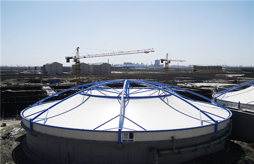 污水池加盖膜结构是一种新型的处理污水池废气的方法,这种方法不仅结构新颖,而且造型优美,安装,维修方便,充分发挥了膜结构建筑的优势。反吊膜结构是以钢结构为主,将膜材反吊的形式进行污水池废气除臭。反吊膜结构作为新型的污水池废气除臭方法,在膜材性能,结构安装和施工方面都具有很大的优。