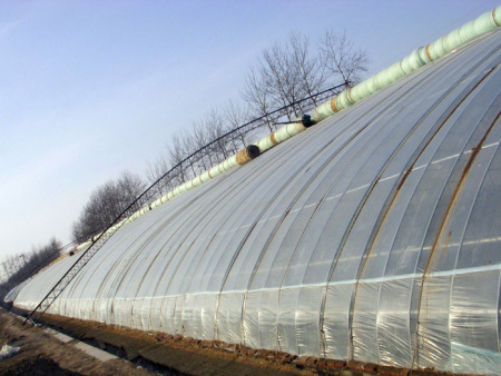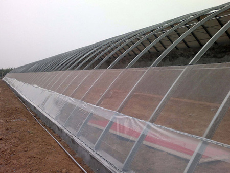 为防止薄膜温室起风,菜农应在东西两侧的底部设置防风膜,防风膜的宽度应从地下到拱形大棚一侧的上风口。比如,西风吹来时,菜农会在西侧覆盖防风膜,防止风从拱形大棚西侧的通风口进入大棚。如果风力超过6级,应打开拱棚下风侧的出风口,这样防风成效比较好。