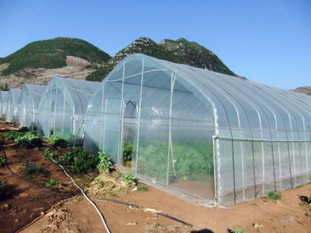 薄膜连栋温室通常指文罗尖顶或弧形顶温室。这种温室的顶棚材料通常是钢化玻璃聚碳酸酯阳光板或薄膜。多跨膜温室由于需要连接拱杆,水箱上有许多孔,也容易漏水。薄膜连栋温室可实现自动控制。配套设备可选择加热系统(热风机加热或水暖加热)内外遮阳及内保温系统微雾滴灌施肥系统水幕风机冷却系统二氧化碳供光系统移动苗床等配套设施。膜式多跨温室如何防。