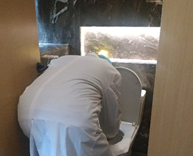 公共卫生间加强空气流通。每日随时进行卫生清洁。公共台面洗手池门把手和卫生洁具等物体表面消毒可用500mg/L的含氯消毒剂进行喷洒或擦拭,30分钟后用清水擦拭干净。