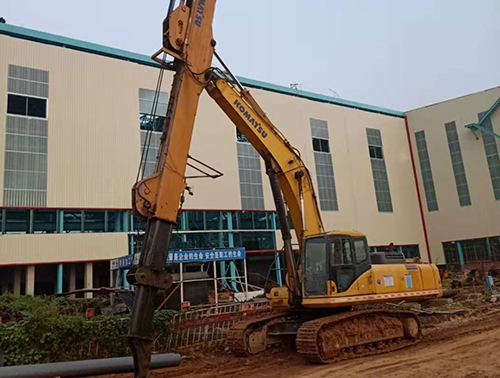 破碎时,由于振动会使锤头逐渐改变方向,所以应随时调整铲斗缸,使锤头方向垂直于破碎物体表面。